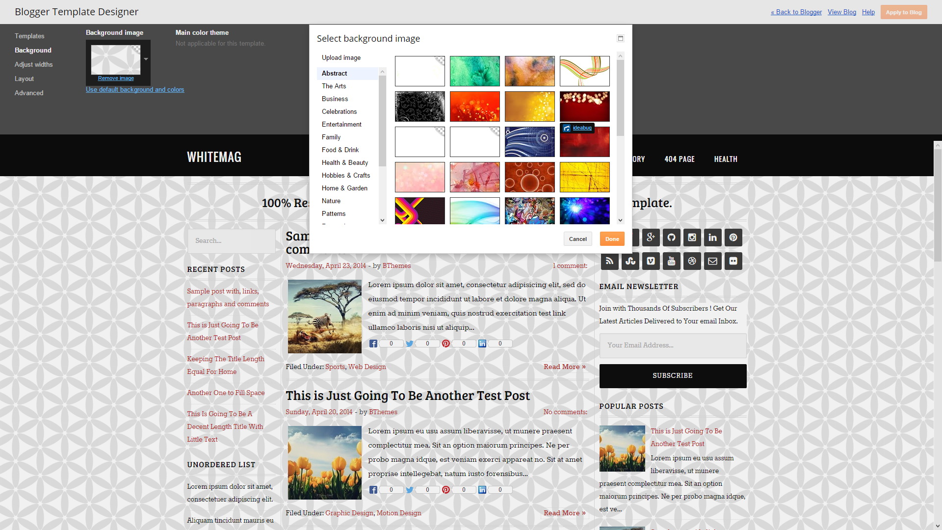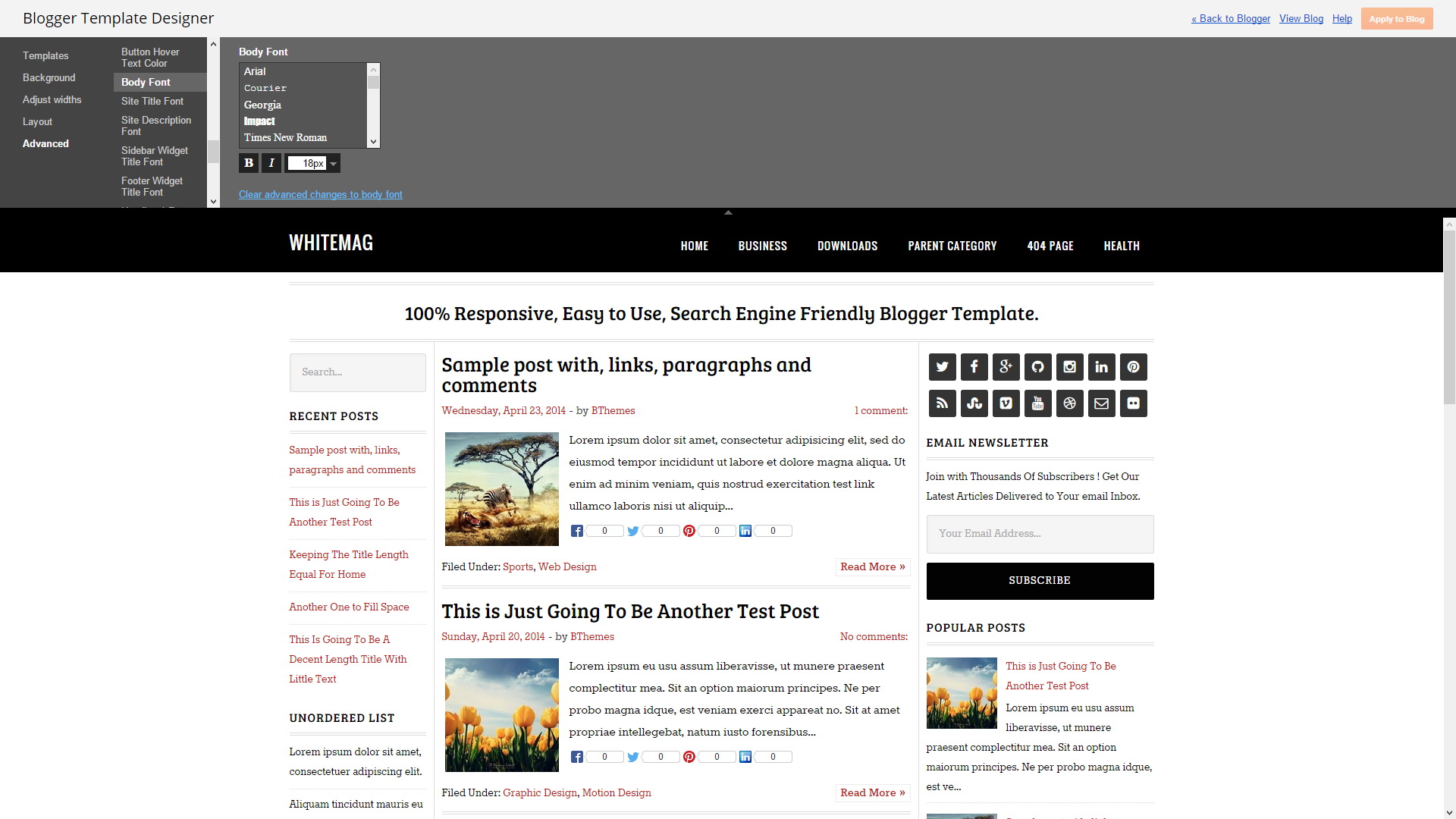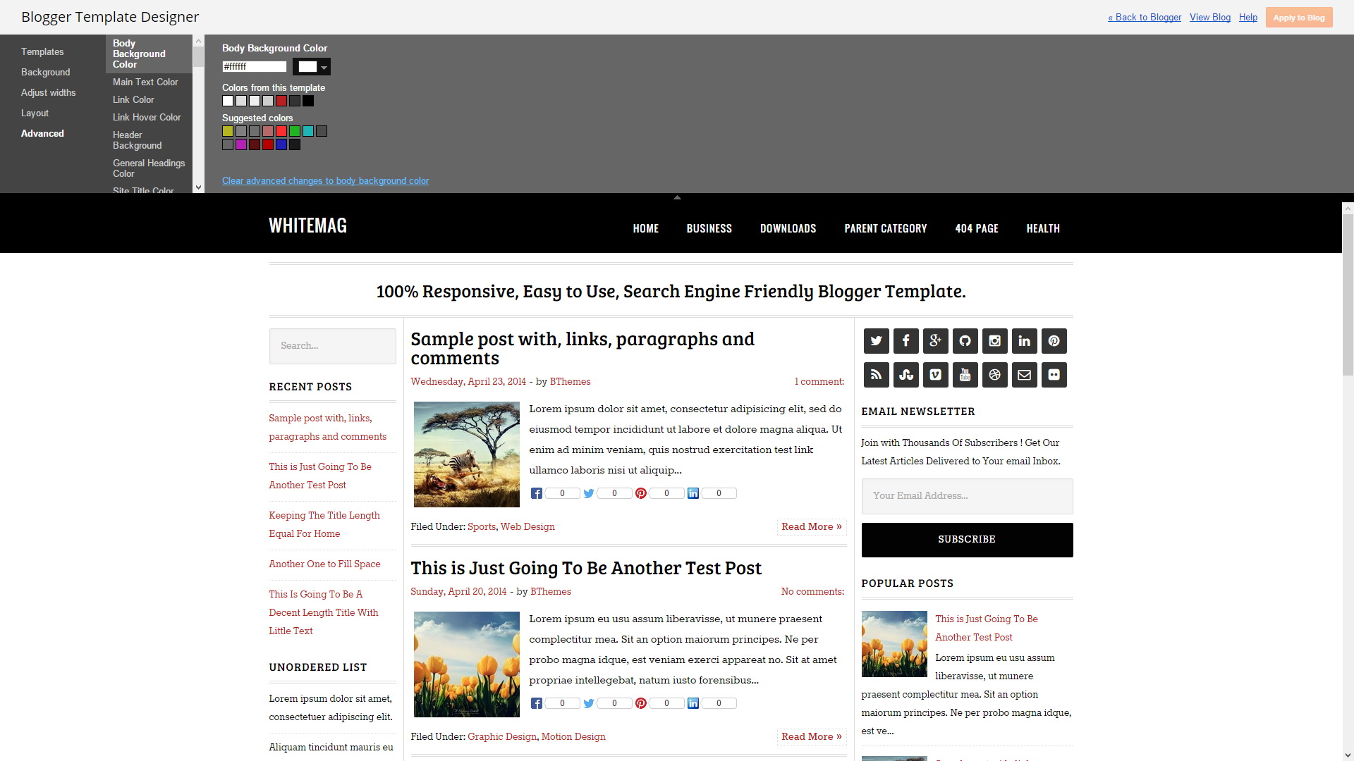 WhiteMag is a clean and beautiful, 100 responsive, SEO friendly, easy to use and template designer compatible 3 columns blogger theme with many features. It has a footer 3 columns widgets section, left and right sidebars, hundreds of web fonts, unlimited colors, icon fonts, background image support, related posts with thumbnails, nice social buttons, sharing buttons, top and bottom navigation menus, auto post summaries on homepage and more.